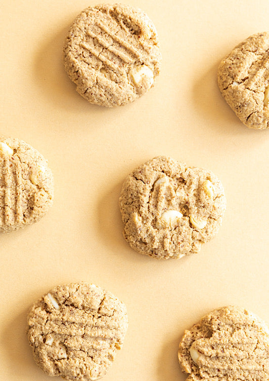 White Choc Chip Ingredients: Milk Chocolate Chips, Brown Sugar, Salted Butter, Wholegrain Oats, Wheat Flour, Egg, Flaxseed, Brewer’s Yeast, Vanilla Extract, Baking Powder.