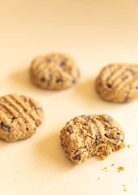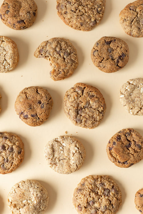 Dark Choc Chip Ingredients: Oat Flour, Dark Chocolate Chips, Coconut Sugar, Salted Butter, Egg, Flaxseed, Brewer’s Yeast, Vanilla Extract, Raising Agent (500).